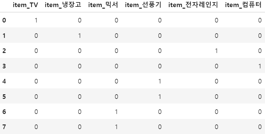 df = pd.DataFrame({'item':['TV','냉장고','전자레인지','컴퓨터','선풍기','선풍기','믹서','믹서'] })